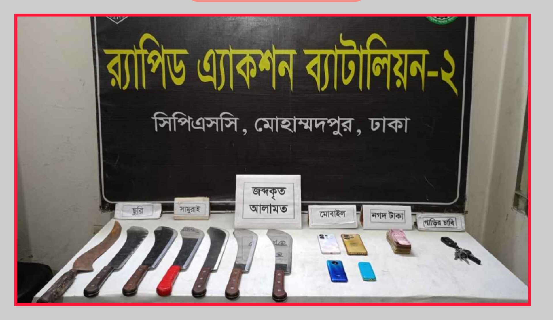 এ সময় ছিনতাইকারীদের কাছ থেকে ৬টি সামুরাই ও ১টি ড্যাগার নামক দেশীয় অস্ত্র উদ্ধার করা হয়।